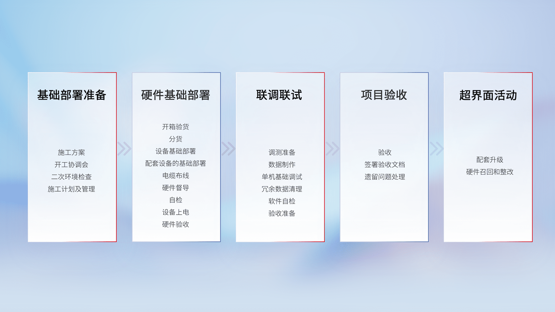 从基础部署准备、、硬件基础部署、、联调联试、、项目验收、、越界面活动的全过程可追溯,,,保证施工质量和进度。。。